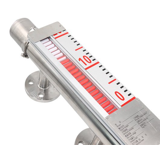 液位計(jì)根據(jù)浮力原理,浮子在測(cè)量管內(nèi)隨液位的升降而上下移動(dòng),浮子內(nèi)的永久磁鋼通過磁合作用,驅(qū)動(dòng)紅、白色翻柱翻轉(zhuǎn)180液位上升時(shí),翻柱由白色轉(zhuǎn)為紅色,下降時(shí),翻柱由紅色轉(zhuǎn)為白色,從而實(shí)現(xiàn)液位的指示。